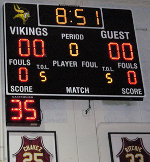 I would like to thank you and the Viking Spirit Fund contributors for the recent donation of $1700. The athletic department decided to put the money towards a new score board in the gym. The score board was ordered and is now installed. The unit actually consists of two electronic boards; one attached to the west wall and one attached to the east wall of the gym. The basketball team has already put the new score board to the test in a recent tournament hosted by the Vikings. It is definitely a great addition to our sports complex. I have attached two pictures of the new boards. Our next project is to consider the addition of a audio visual system for gymnasium. It would consist of two screens and two LCD projectors (home and visitors) that would be attached to the rafters and would be controlled by wireless remotes. Computers would then be used to display PowerPoint presentations, videos and the like. There is even talk of a possible satellite TV feed. Coaches, teachers and administrators can think of hundreds of applications for the new system.